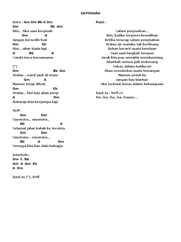 Related books free with a 30 day trial from scribd. Walau nanti jauh di mata. Nah, disaat momen perpisahan ada sedertan lagu yang bertemakan perpisahan tentang sahabat, pacar dan maupun keluarga. lirik lagu sayonara sayangku (grace simon) kini tiba saat berpisah. sayonara kini tiba saat berpisah jangan bersedih hati kini akan kau tinggal pergi teringat tawa dan candamu kini akan jauh di matatapi dekat di hati kini akan tiada lagi semoga tuhan meridhoi sayonara sayonara Walaupun di lirik lagu ini beberapa kali menyebutkan kata 'kawan', saat diberikan kepada guru bisa kamu ganti jadi kata guru. Not lagu not angka indonesia terlengkap 2019. Belaian sayang cumbu dan rayu. Dalam momen perpisahan, satu lagu dari sheila on7 yang berjudul "sebuah kisah klasik" Anda mengetahui judul dan nama penyanyi. sayonara sayonara, selamat tinggal adikku tercinta. Not angka selamat tinggal virgoun ft audy. Indonesia sekolah dasar terjawab tuliskan lirik lagu yg berjudul perpisahan 2 lihat jawaban.